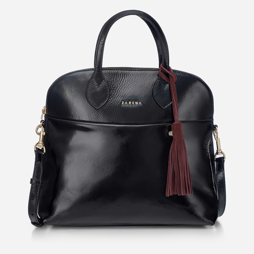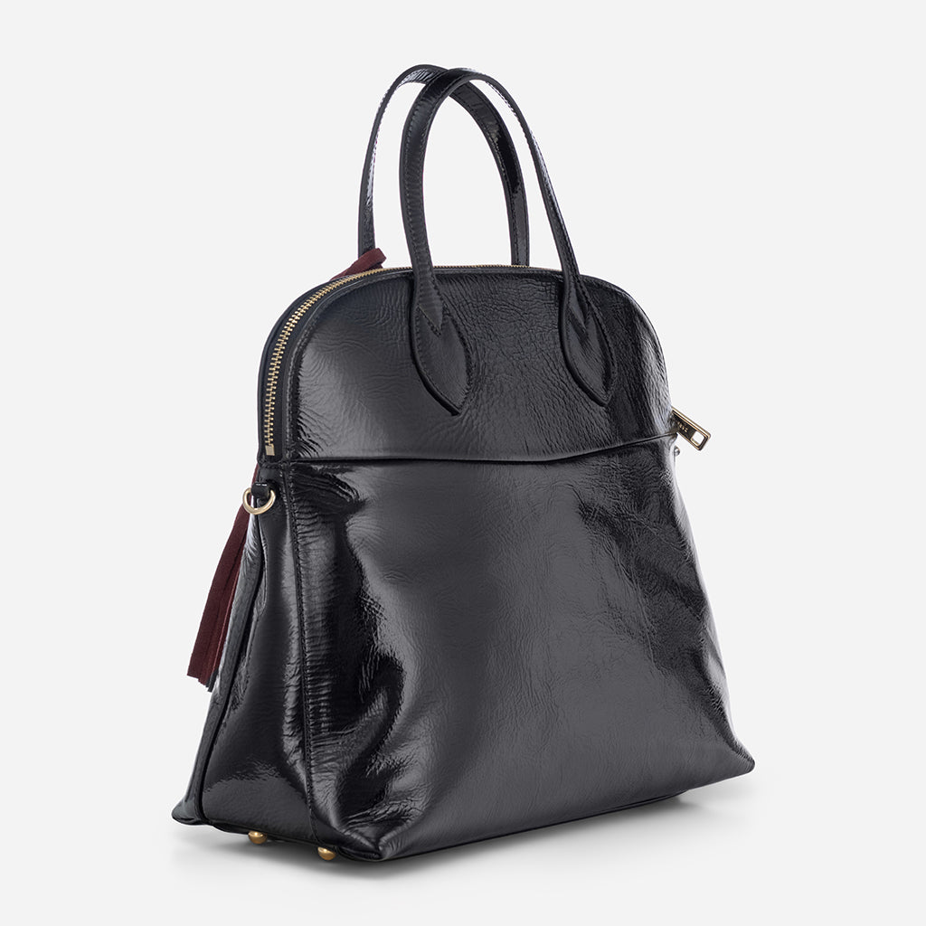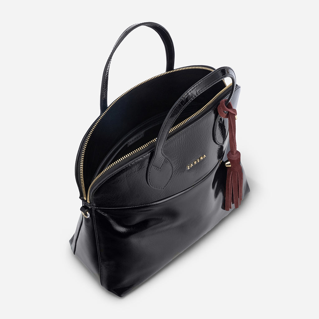 Dany – μαύρη τσάντα από λουστρίνι με μπορντό κρεμαστό αξεσουάρ